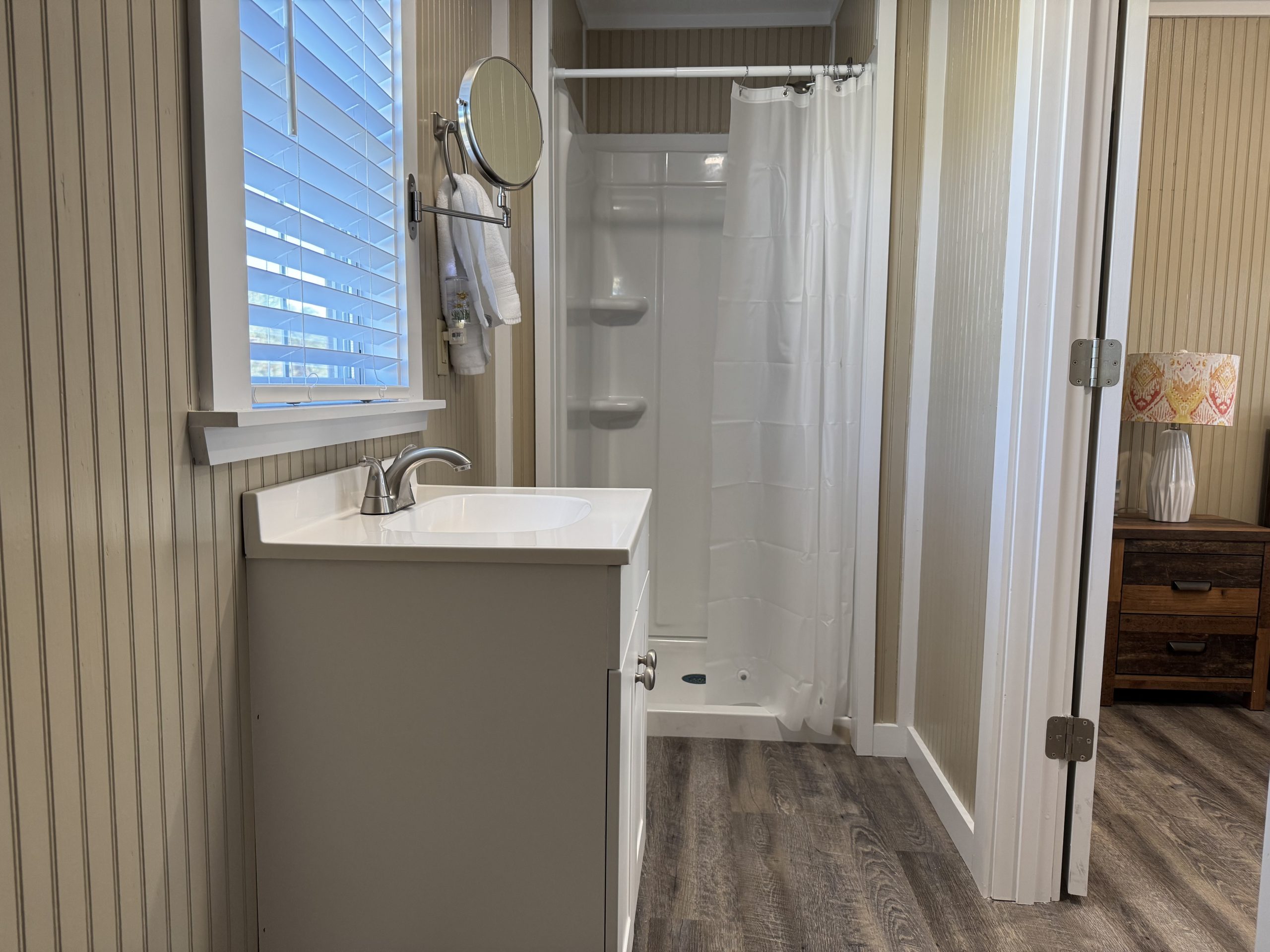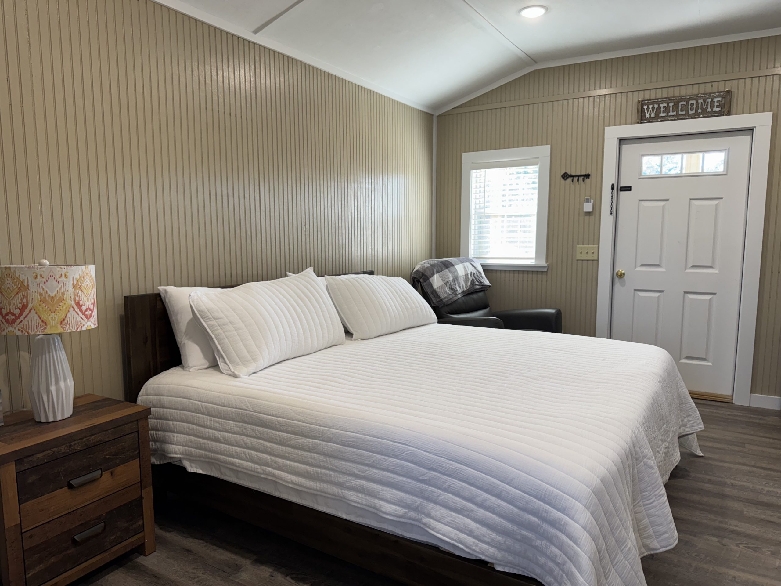 Rustic Retreat sleeps two adults comfortably. Perfect for couples seeking a romantic escape, solo travelers craving solitude, or remote workers trading their home office for a water view. Exterior security cameras provide peace of mind.